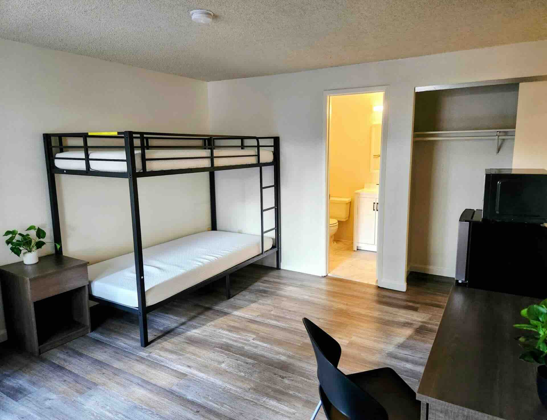 APPLY NOWOur spacious studio apartments come fully furnished with a full-size mattress, bed frame, nightstand, desk, desk chair, microwave, and mini-fridge. A kitchen with stainless steel appliances is shared by three other studios. Enjoy our study/resident lounge and furnished outdoor courtyard surrounded by beautiful and mature trees. Ample parking is also available at no additional cost.
